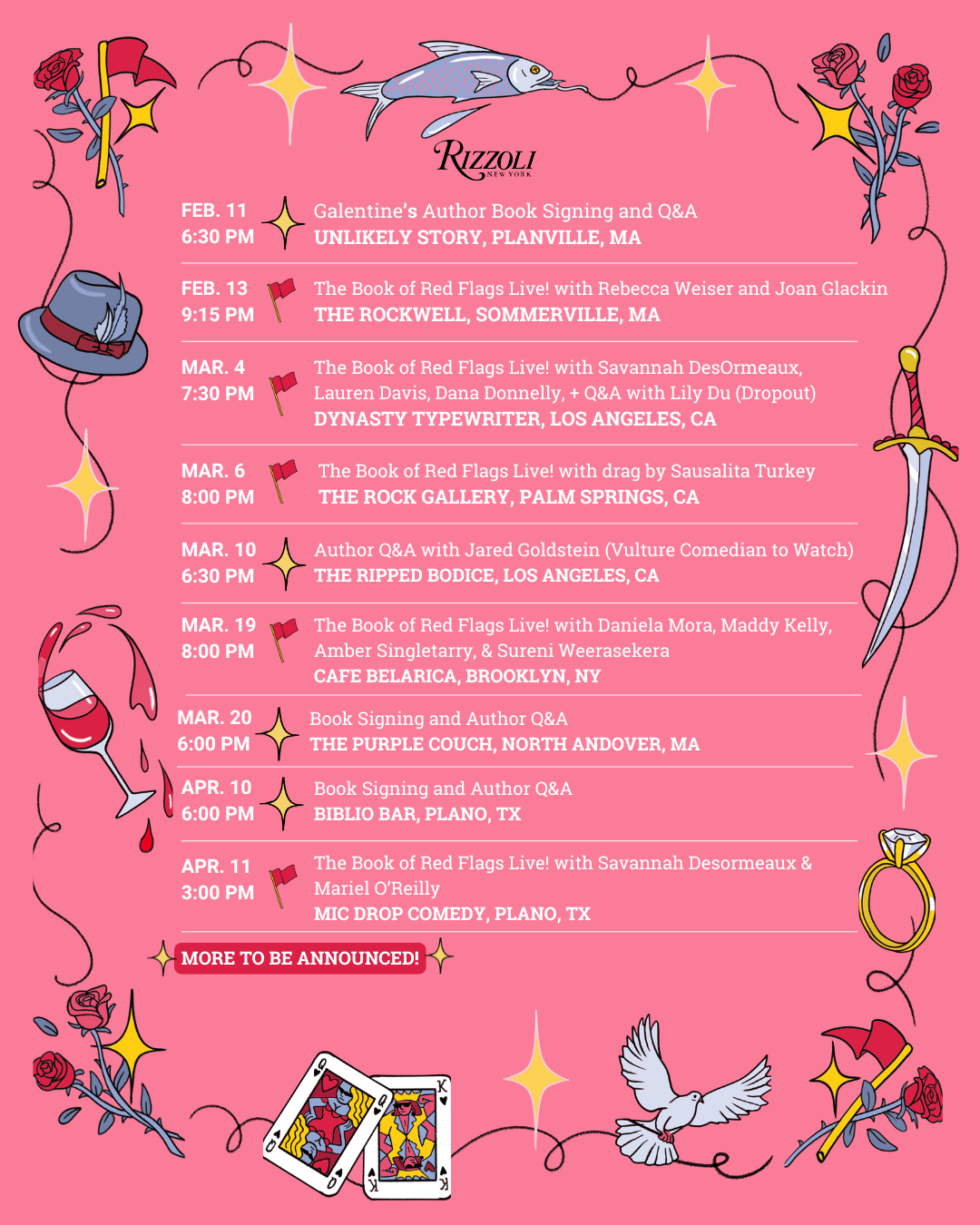 As a writer, her personal and humor essays have been featured in the New York Times’ Modern Love, Cosmopolitan, McSweeney’s, the New Yorker Shouts & Murmurs, and her Substack Night Out about going out and dating in NYC has 10k+ subscribers and was a 2024 Featured Publication. She is the author of The Book of Red Flags with Rizzoli Publishing in bookstores now!